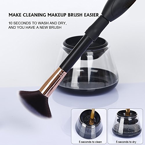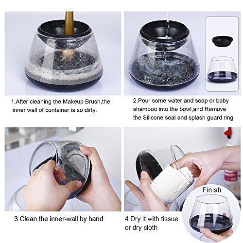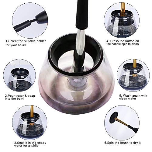 - Easy to use: 1. Install the battery; 2. Attach the brush to the spinner with the appropriate sized collars; 3. Add water and cleaning solution to bottle;4. Two modes of speed, first press the switch with low speed, soak the foundation brush, and then press the high speed switch again, making the makeup brushes rotating to clean; 5. Remove after 5-10 seconds used; 6. Don't close the switch, spin the brush to dry it above the water