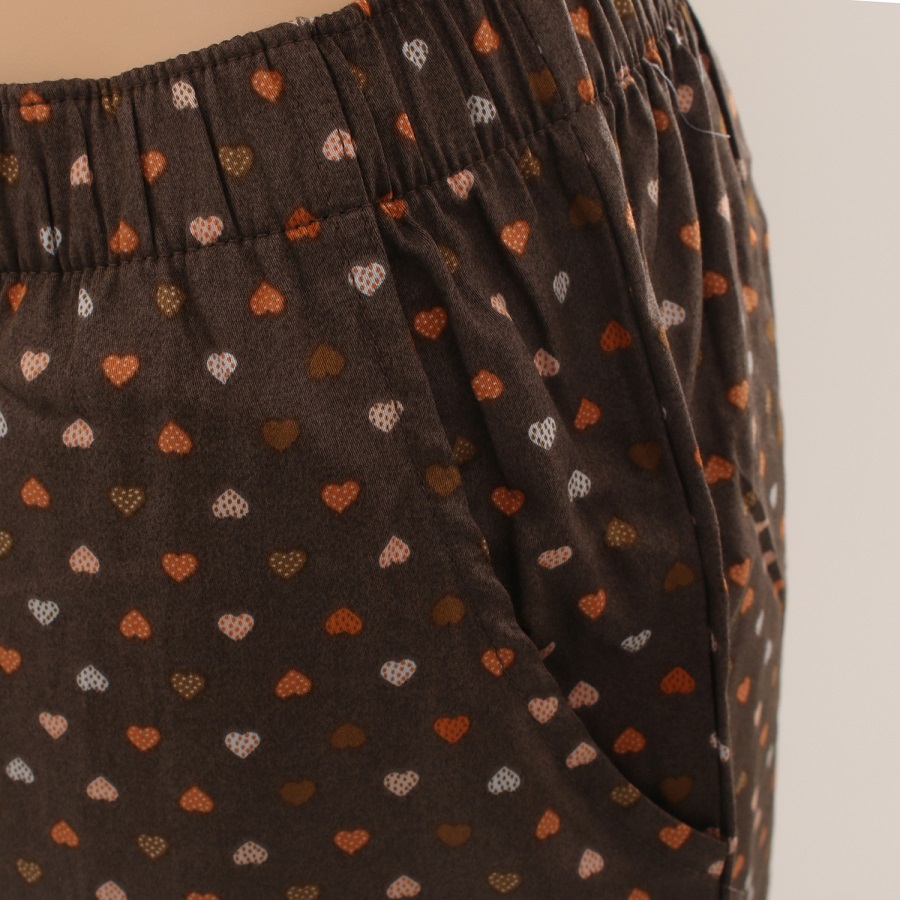 남녀 모두 동일한 컬러의 브라운 하트 나염 긴 여자 바지 제품 입니다.