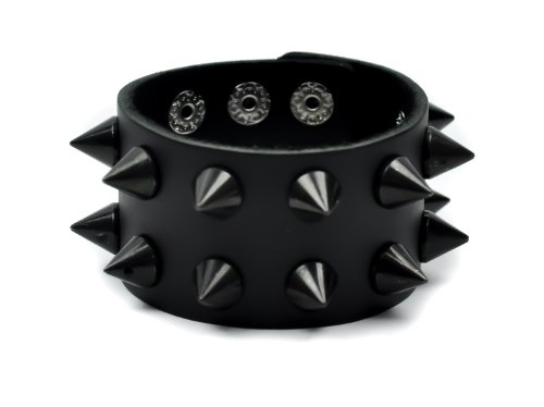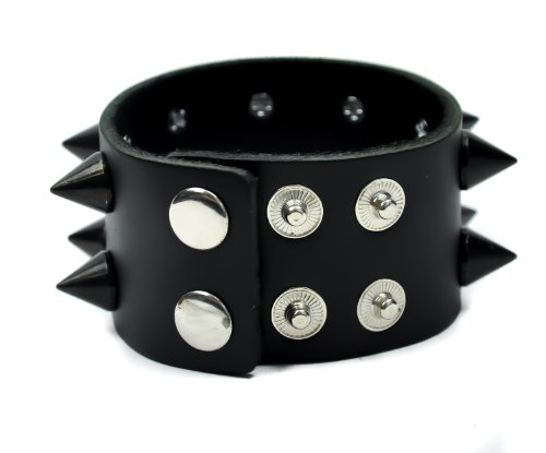 -. Feature : Black Leather Wristband / Fat 1/2" Cone Spikes - 2 Rows / 1-1/2" Inches Wide / Sizes. 7", 7-3/4", 8-1/2" Inches. / Snap Closure