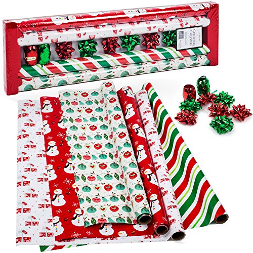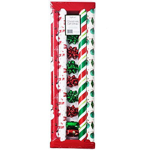 Studio : Tablesto Publisher : Tablesto Binding : Health and Beauty Product Description This Christmas gift wrap is fashionable and trend-setting designed with a touch of class and flair. Its many colors, Christmas patterns and holiday designs make that special moment under the tree or any other time during the holiday seasons exciting and sensational. Versatile enough for all ages and all your festive holiday gift-wrapping needs. Designed specifically with the holiday season and theme in mind! Suitable for babies, toddlers, children, teenagers, adults and seniors. Also, ideal for crafts, projects and banquets or festive holiday table covers. Comes in roll form consisting of 4 separate individually designed and wrapped in plastic, not folded avoiding all creases. Each roll measures 2.5 ft x 10 ft. Paired with 7 self adhesive metallic colored bows and 2 ribbons for extra pizzazz. This wrapping paper adds an extra special touch enabling the recipient to be wowed and surprised. After all it's not really a gift until it's really wrapped! 0