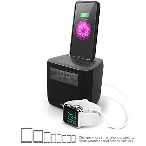 Whether you have the latest iPhone 6 or iPhone 5 or less recent iOS devices, we've got you covered. Charge and play via flexible Lightning dock. The iPL23 is a great looking, space-saving speaker system for listening to all your music. Wake or sleep to your favorite iPhone or iPod tunes or FM radio stations through high fidelity drivers in a specially designed Reson8® speaker chamber. Auto sync feature instantly sets clock to iPhone or iPod time.Feature
