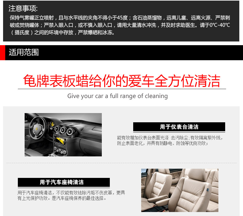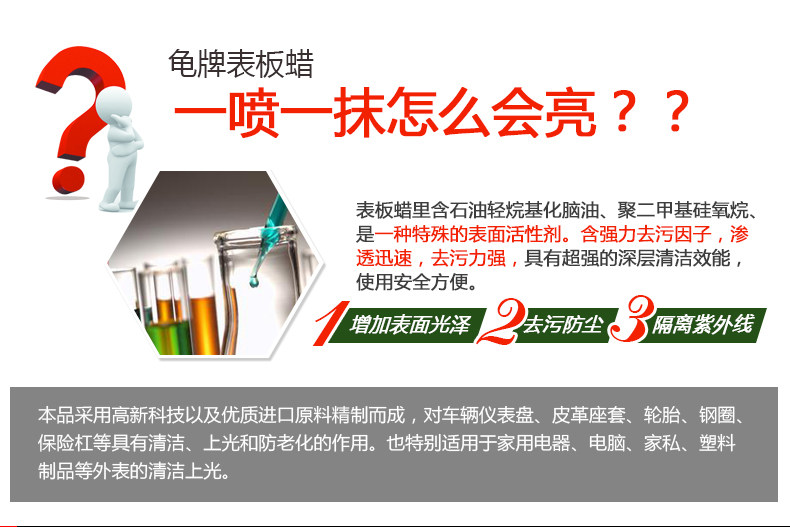 Increase surface gloss decontamination dust can isolate the ultraviolet ray effectivelyprevent plastic ageing and has anti-static anti-corrosion and other excellent efficacy;convenient operation a touch of spray decontamination polishing protection is finished;