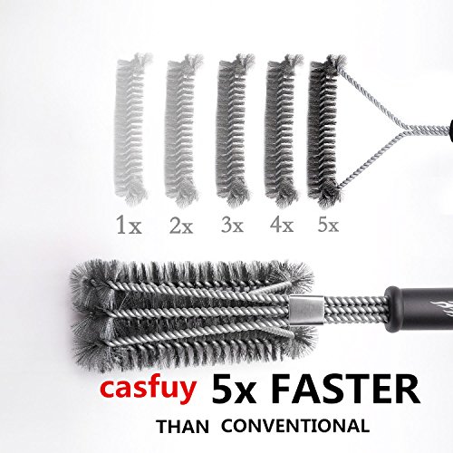 【3 in 1 Brush for Effortless Cleaning】 Casfuy grill brush head is 5 times larger than ordinary brush as its unique 3 brushes in 1 design, faster remove food, grease, and debris. The strong and thick stainless steel woven wire can easy to get to any sections even the most edges and those challenging grooves of the grill