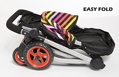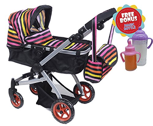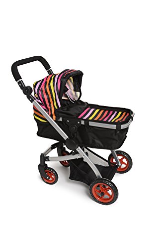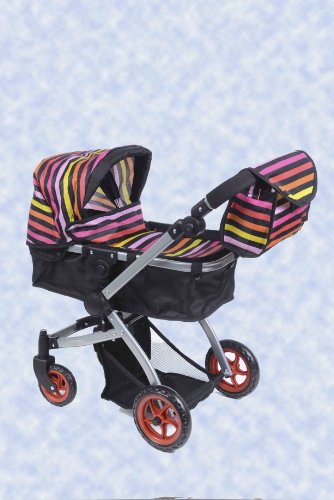 Baby's got a brand new ride with this stylish 4-wheel stroller. Its swiveling Back wheel and comfy handles to set to your specific height and you could switch the handle from front to back makes it a breeze for little mommies to push around the neighborhood, while its Multi color print are sure to catch everyone's eye. Little girls love the dipper bag for their baby dolls before setting off on wonderful walks. Designed for dolls up to 18 Inch. Doll not included.Feature