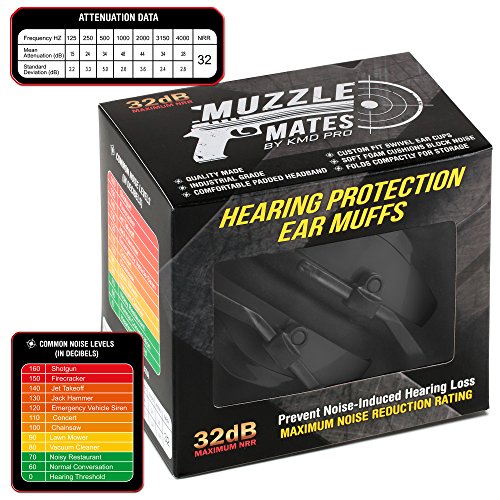 -. Feature : SUPERIOR HEARING PROTECTION: The Muzzle Mates ear muffs are professionally designed to block the widest sound spectrum. With a genuine noise reduction rating of 32db, these make the perfect ear muffs for shooting, construction work, NASCAR events, hunting, power tool use, and other dangerously loud environments. / EXPERIENCE TRUE COMFORT: Our noise cancelling ear muffs feature a padded headband and specially crafted padded cups to make for unrivaled comfort even during prolonged wear. The cups of the safety earmuffs can easily be adjusted to accommodate any head size, ensuring a nice fit on kids, women, or men. / DESIGNED FOR PORTABILITY: These conveniently lightweight soundproof earmuffs can easily be folded to greatly save on space and allow for maximum portability. Pack them with the rest of your gun range accessories without dealing with bulk. / HEAVY DUTY PERFORMANCE: Made using premium materials, these noise reduction ear muffs are your best bet when tackling the outdoors. Designed to weather through rain, dust, mud, and sweat, our industrial-grade protective earmuffs are the perfect complement to your hunting weekends or trips to the shooting range. / RISK FREE PURCHASE: The Muzzle Mates ear defenders come with a no-hassle 1-year warranty to give you absolutely nothing to lose. Experience the ultimate gun range hearing protection completely risk free. Click 'Add to Cart' now!