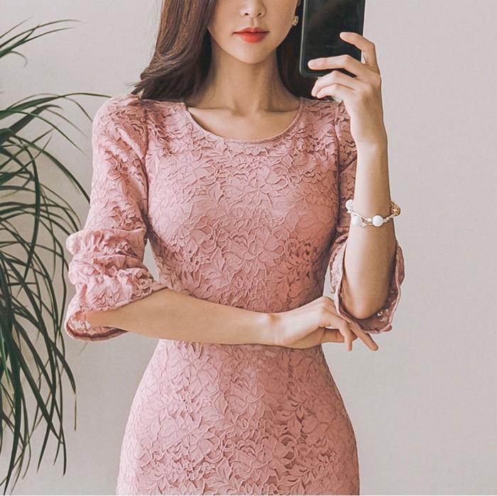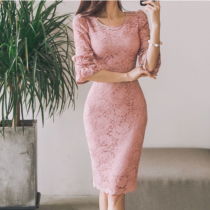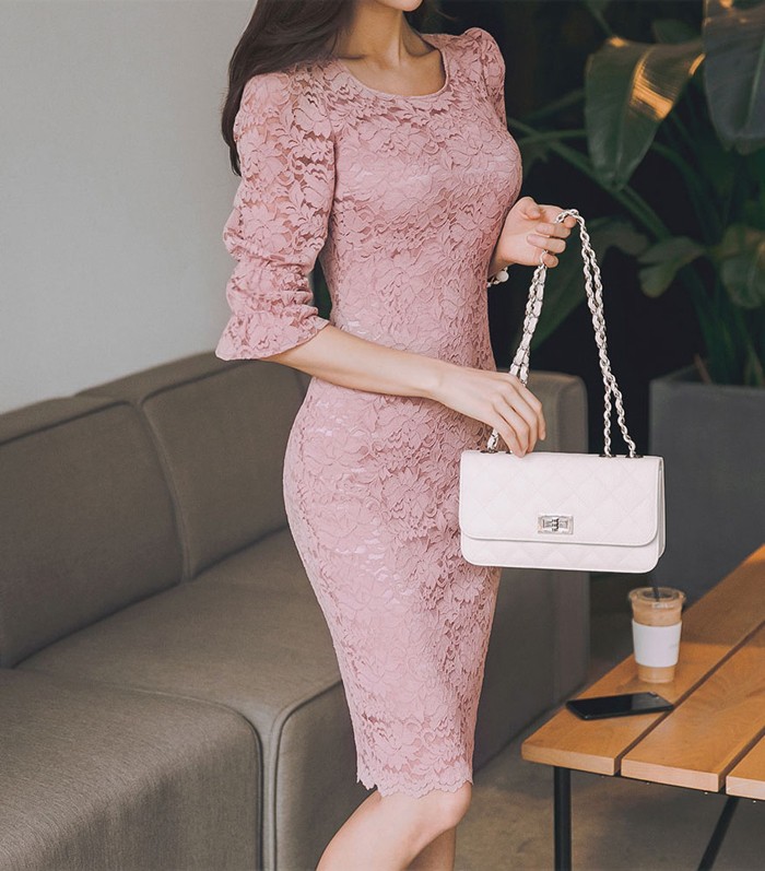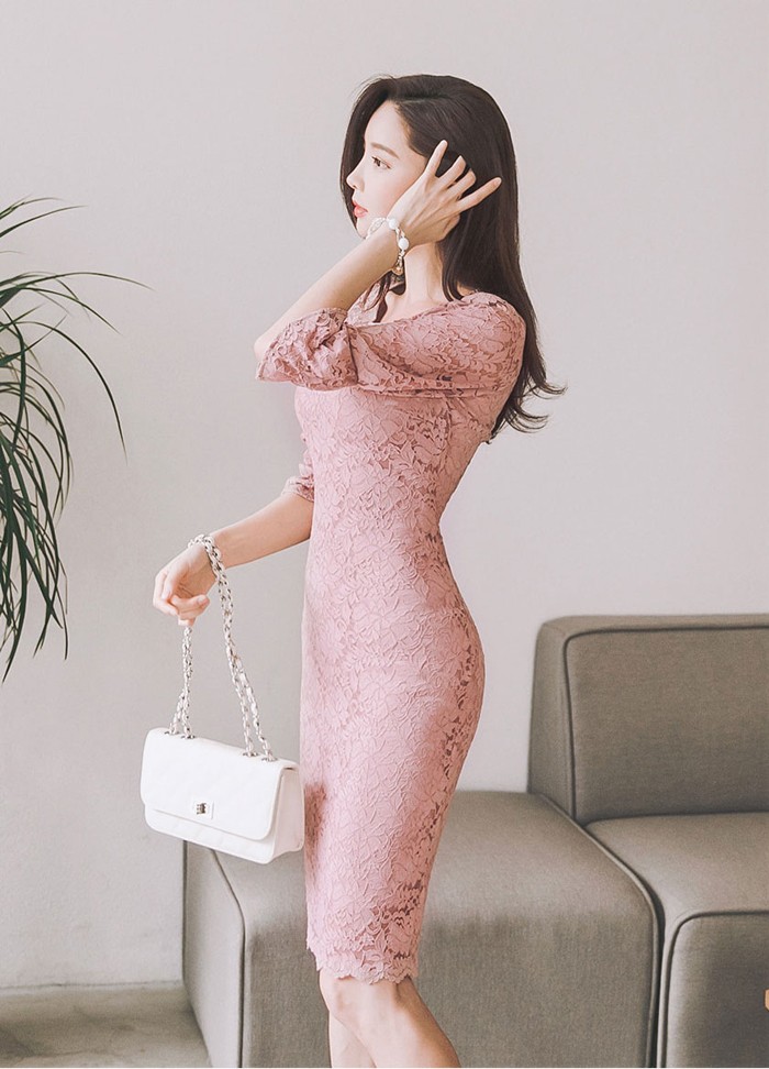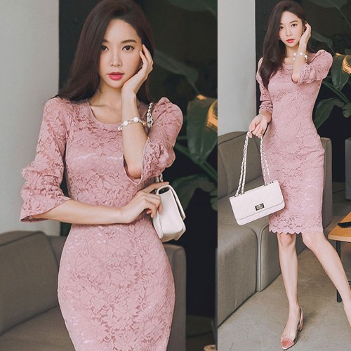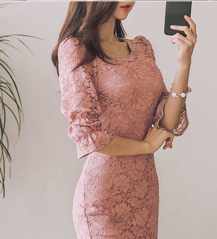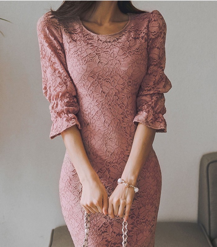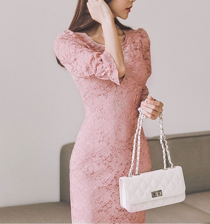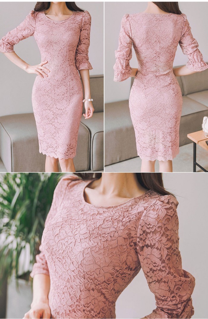 商品名:ワンピース 5分袖 レース配色 膝丈 きれいめ 通勤