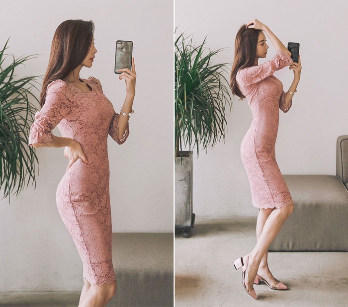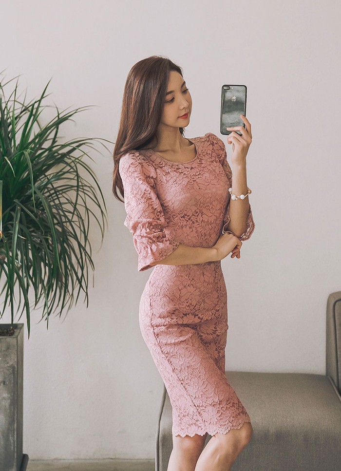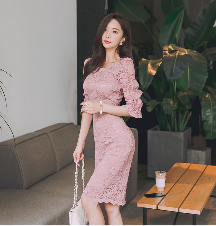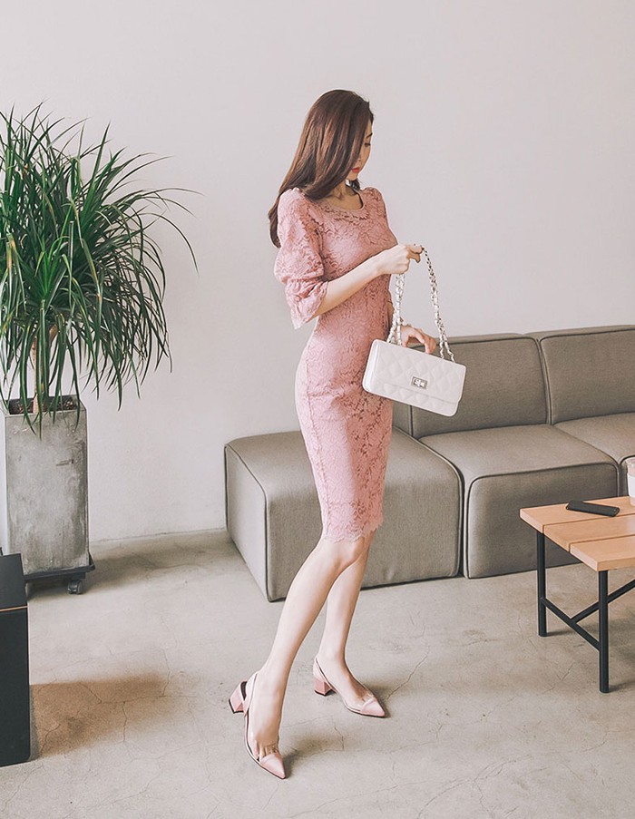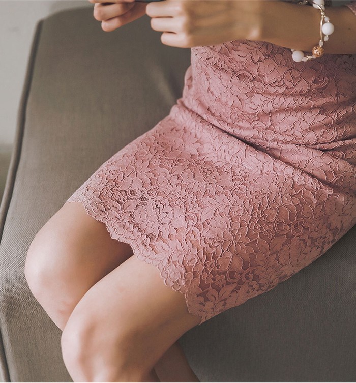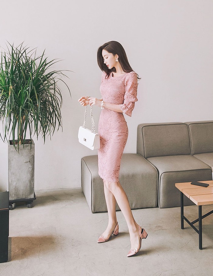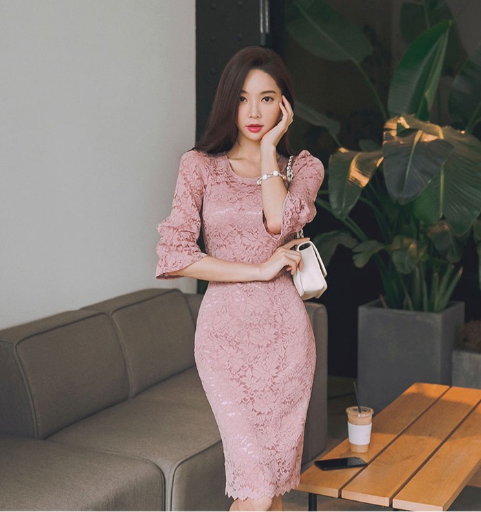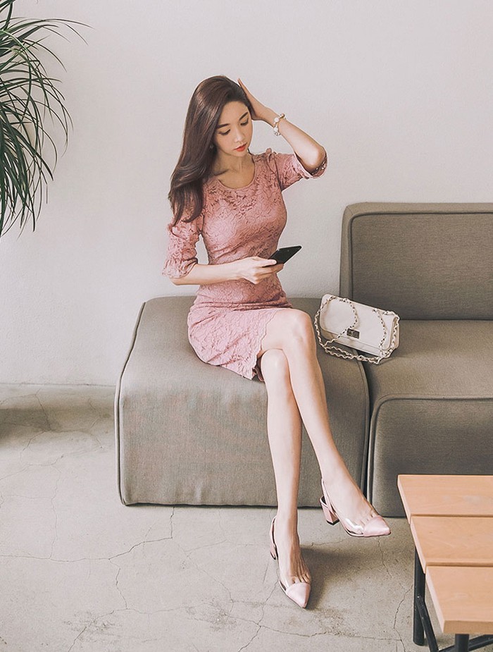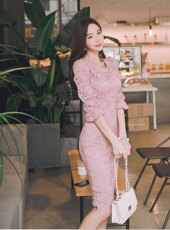 商品名:ワンピース 5分袖 レース配色 膝丈 きれいめ 通勤