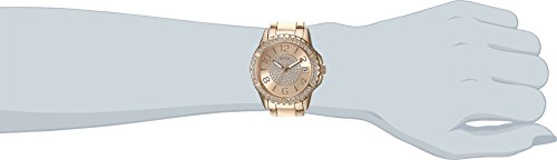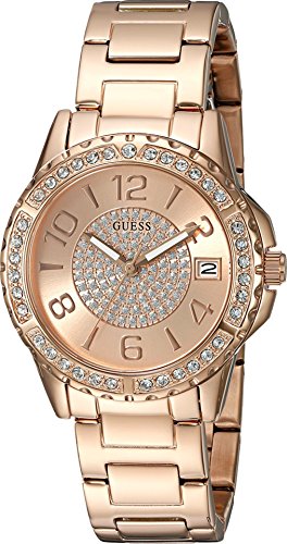 Shimmering accents add light-catching shine to this glamorous rose gold-tone watch. Complete with an analog design and date function, it's an essential for the GUESS Girl on the go.Feature