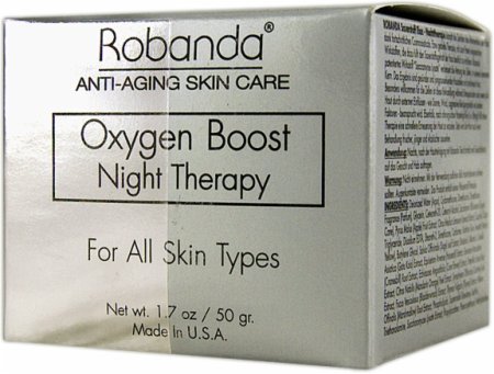 -. Binding : Misc. -. Brand : Robanda -. EAN : 0794866391906 -. Feature : Oxygen boost night therapy cream Smooth fine lines and wrinkles with this innovative formula that increases the utilization of oxygen into the skin for a more youthful appearance / Contains Saccramyces Lysate to increase cell respiration at the cellular level for radiant, healthy skin that is deeply nourished and moisturized / Use before bed to wake with refreshed, moisturized skin -. IsAdultProduct : 0 -. Label : Robanda -. Manufacturer : Robanda -. MPN : ROB011 -. NumberOfItems : 1 -. PackageQuantity : 1 -. PartNumber : ROB011 -. ProductGroup : Beauty -. ProductTypeName : BEAUTY -. Publisher : Robanda -. Size : 1.7 Oz. -. Studio : Robanda -. Title : Robanda? Oxygen Boost - Night Therapy For All Skin Types, 60 g -. UPC : 794866391906