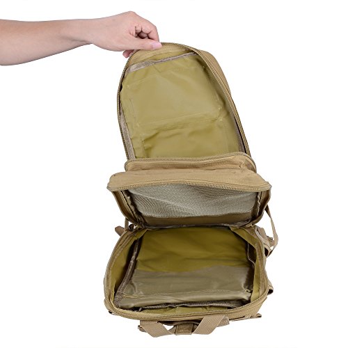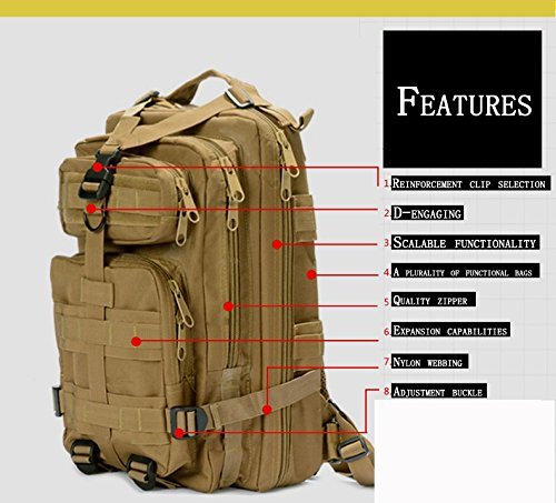 -. Binding : Misc. -. Brand : JTORD -. Color : Tan -. EAN : 7777788426768 -. Feature : ☆Mainly made with high-grade durable imported 600D oxford spinning fabrics and 420D nylon lining with super waterproof function.high professional waterproof coating on the back. / ☆Adjustable shoulder, chest and waist straps,suitable for heavy carrying. / ☆Breathable mesh backing for comfort.It is propitious to breathe. Enhanced back support for ventilation and comfort. / ☆Designed with spacious main compartment with zip around closure, interior zip pocket and mesh pocket. / ☆Multiple pockets to meet you at the most.Capacity: 30L,Size: Approx. 43x26x23cm / 17x10.3x9 Inches. -. IsAutographed : 0 -. IsMemorabilia : 0 -. Label : JTORD -. Manufacturer : JTORD -. PackageQuantity : 1 -. ProductGroup : Sports -. ProductTypeName : SPORTING_GOODS -. Publisher : JTORD -. Size : 17x10.3x9 Inches -. Studio : JTORD -. Title : Outdoor Tactical Backpacks Large Capacity 3P Assault Pack Rucksacks for Outdoor Hiking Camping Trekking Hunting Tan Waterproof