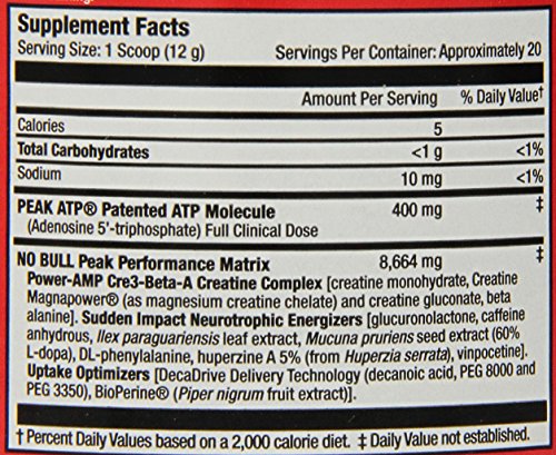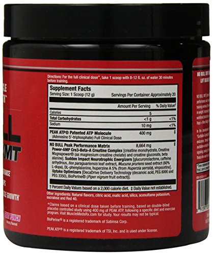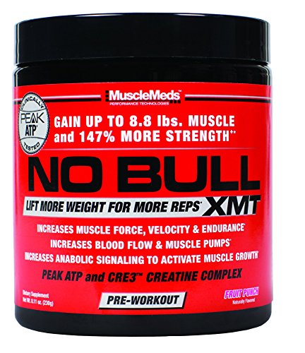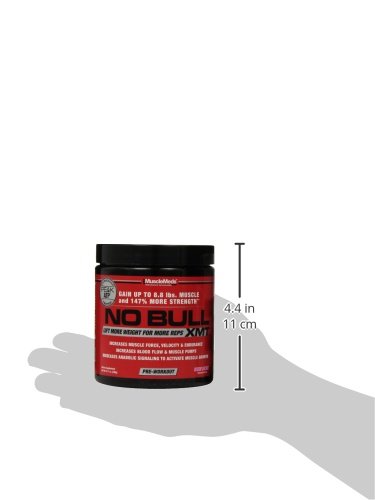 NO BULL XMT Pre-Workout Formula enhances muscle force, velocity and endurance allowing you to lift heavier weights for more reps. The end result is Bigger, Stronger Muscles and Better Workouts! NO BULL XMT (Extreme Muscle Tension) has been formulated with clinically researched ingredients to enhance workout performance and muscle growth through a proven training concept called "Time Under Tension." During a resistance weight training workout, the amount of time your muscles work is measured in repetitions and the amount of tension is measured in weight. Increasing the numbers of reps (time) and the amount of weight on the bar (tension) during a set increases the workload placed on your muscles and stimulates maximum muscle growth. NO BULL XMT is formulated to do just that - More Reps + More Weight= More Muscle Growth. In the development of NO BULL XMT, MuscleMeds researchers focused on a key mechanism in muscle coined "Excitation-Contraction." Enhancing this mechanism of action in muscle tissue helps increase muscle force, velocity and endurance thereby increasing "Time Under Tension" and total workout performance. In addition to enhancing muscle "Excitation-Contraction," NO BULL XMT's advanced synergistic design also increases energy, muscle pumps and anabolic signaling, making it the ultimate performance enhancing pre-workout formula. NO BULL XMT is the Pre-Workout Formula for those who want more. More Reps + More Weight = More Muscle Growth!Feature