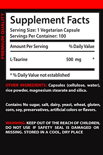 -. Feature : L-TAURINE: Taurine is a amino acid and one of the most abundant compounds in the brain, heart and muscles. It plays an important role in many aspects of good health. Our product helps boost the levels of Taurine to benefit you in many different ways like having less stress, improve muscles, burn unwated fats and many more. Our product is all natural and includes 500mg of taurine per capsule to support you. / TAURINE EXTRACT FOR LESS STRESS LEVELS: If you are having problems with stress from time to time then our L-Taurine can help benefit you. Our product can help calm down the nervous system by raising your GABA (Gamma-Aminobutyric Acid). This can help allow you to manage anxiety so that your thoughts dont go out of control. / TAURINE PILLS TO IMPROVE YOUR MUSCLES: Our product can be beneficial for your muscles to perform harder, longer and safer. It can help to increases the capability of your muscles both in the heart and joints. As a result, your exercise performance is more powerful than before. Also our natural product can help to make you exercise longer than usual. / TAURINE CAPSULES TO SUPPORT TESTOSTERONE: One of the main benefits of taurine is that it works as a anti oxidant to support you from oxidative stress. Taurine can help support the testicals from oxidative stress therefore stopping the loss of testosterone as a result. This can help you maintain testosterone levels and gain more while in the process. / OUR GUARANTEE: PREMIUM QUALITY SUPPLEMENT MANUFACTURED IN THE USA! We use only the very best ingredients, all of which are manufactured in state-of-the-art facilities, with strict adherence to good manufacturing practices (GMP).
