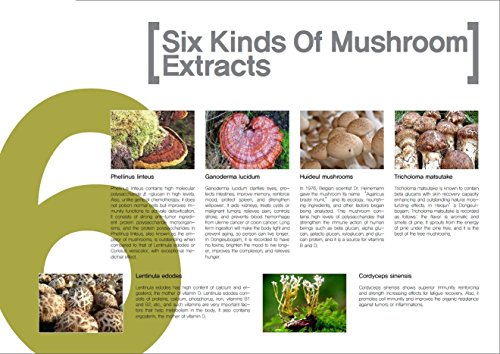 - Contains 6 mushroom extracts Mushrooms well known as wondrous drug contain an abundance of polysaccharide, amino acid, beta glucan, etc., extracts from Phellinus linteus, Ganoderma lucidum, Agaricus blazei, Tricholoma matsutake, Lentinula edodes, and Cordyceps sinensis to aid anti-aging and moisturization effects.