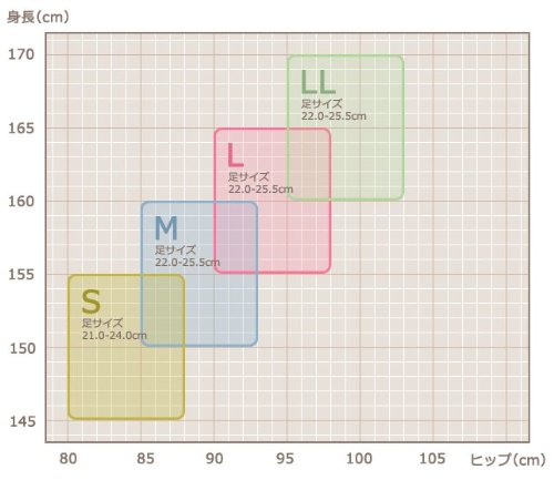 サイズ選びの目安 S(身長145~155cm、ヒップ80~88cm、足21~24cm)、 M(身長150~160cm、ヒップ85~93cm、足22~25.5cm)、 L(身長155~165cm、ヒップ90~98cm、足22~25.5cm)、 LL(身長160~170cm、ヒップ95~103cm、足22~25.5cm)