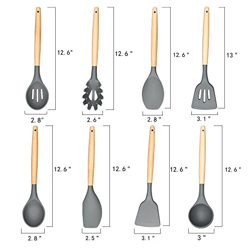 -. Feature : ✌ ALL IN ONE SET: 8 pieces of kitchen utensils include Slotted Spoon, Soup Ladle Spatula, Spoon, Turner, Spoon Spatula, Spaghetti Server, Slotted Turner with wood handles and durable silicone heads are all for what you need in kitchen. / ✌ SAFE AND ENCO-FRIENDLY: They are made of food safe materials with superior quality. FDA approved, BPA free and latex free. Non-stick and non- toxic. / ✌ HIGH QUALITY: Food Grade Silicone is high toughness and thay will not discolor, warp, melt or chip and the silicone withstands temperatures of up to 480°F. / ✌ EASY TO CLEAN AND STORAGE: These sets are incredibly easy to clean and hand-washed is recommended and the hanging loops is convenient to storage. Please Do not use dishwasher to clean. / ✌ 100% SATISFACTION GUARANTEED: If you are not satisfied with our product, we will fully refund and if you have any questions, please feel free to contact us.