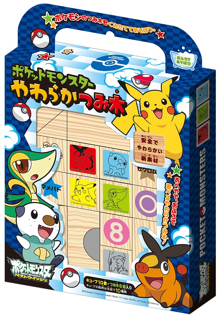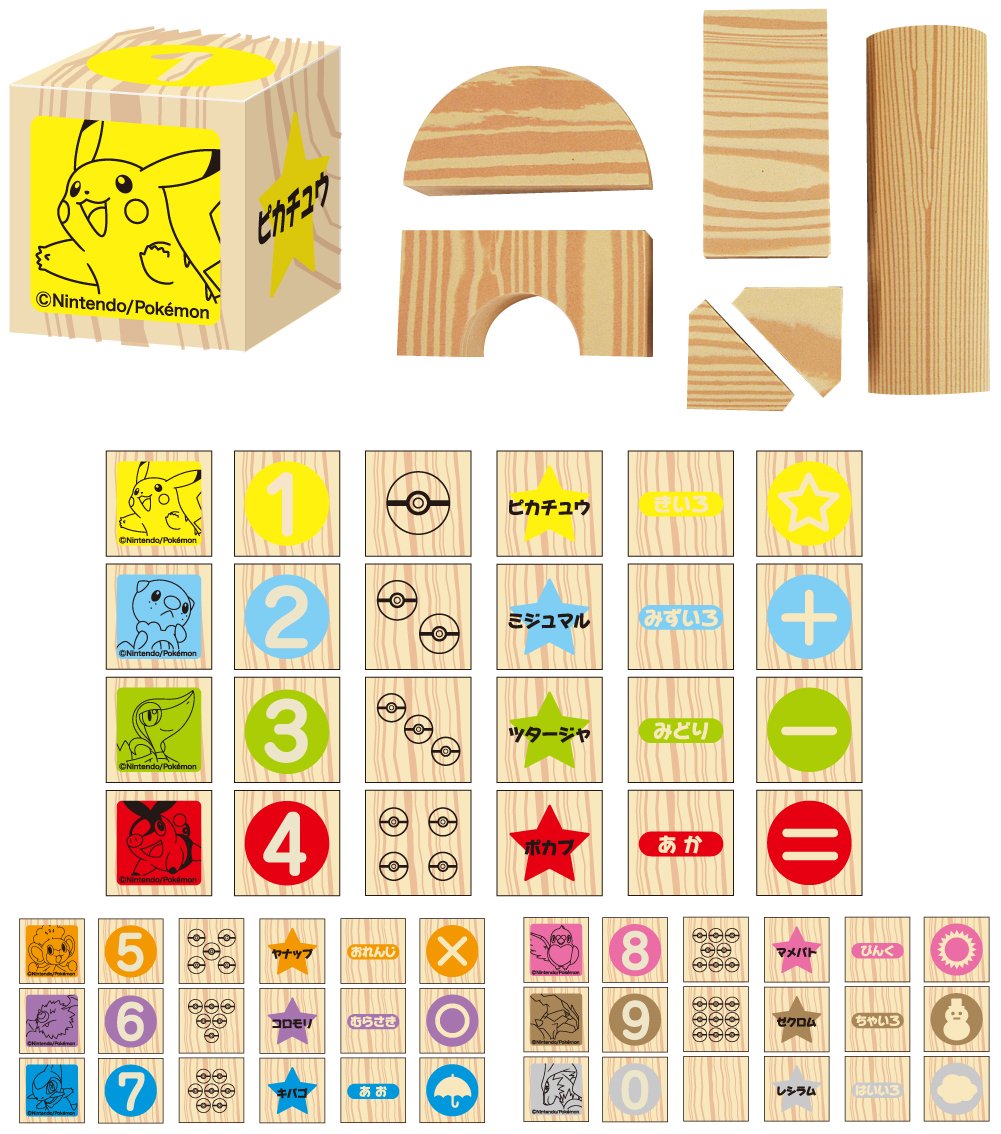 A set of 10 cubes and 6 garbage trees with numbers and symbols, Pokemon prints.