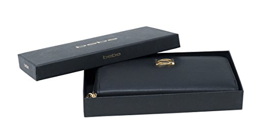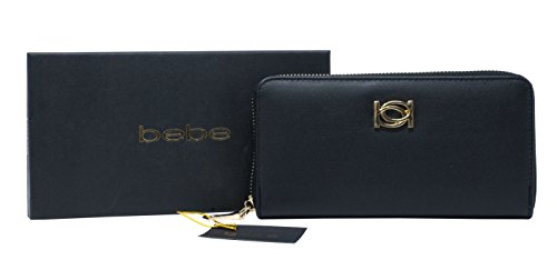 Black exterior with the Bebe (bb) logo name in gold. The interior opens to 8 credit card slots, a zipper pocket, and 4 larger slip pockets. Measurements: Approximately 7 1/2 "W x 4"H. Tag Information: Olivia Zip Around US:1SZ WBE10-384 BlackFeature