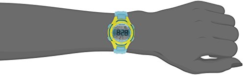 Light blue resin case; lime green bezel with graphics; light blue resin strap with buckle closure