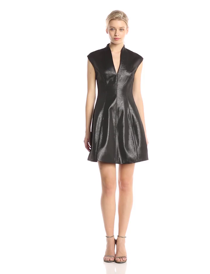 Structured fit-and-flare dress in metallic finish featuring low-standing collar, deep V-neckline, and full-length vertical seaming Center back zipper Lined Brand : Halston Heritage Item model num : AH151193 EAN : 0846153591480 Product Dimensions(LxWxH) :