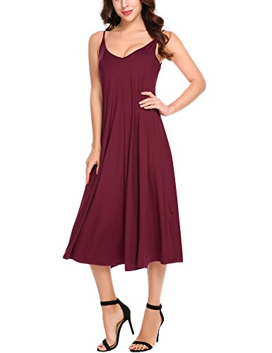 SIMPLE DESIGN: Spaghetti strap, v-neck, solid color, mid-calf length, tunic style, swing Hem, soft, A-line trapeze midi dress.