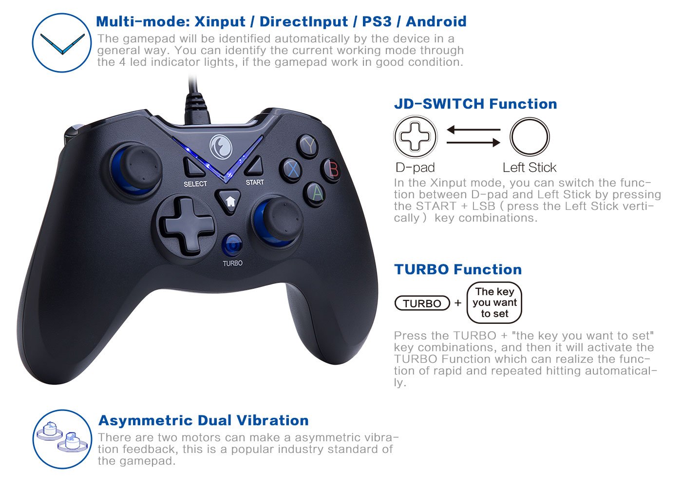 In the Xinput mode, you can switch the function between D-pad and Left Stick by pressing the START + LSB (press the Left Stick vertically) key combinations.