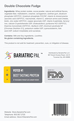 Studio : BariatricPal LLC Publisher : BariatricPal LLC Binding : Health and Beauty Product Description Wouldn't it be nice if you could get your protein, vitamins, and fiber in one easy shake - and lose weight at the same time? That's why we made BariatricPal Protein One. BariatricPal Protein One can help you lose weight, fight hunger, and stay nourished as you enjoy the delicious formula. The great-tasting shake can help you cut calories and carbs and lose more weight. The unique blend provides 27 grams of high-quality medical grade whey protein, 28 essential vitamins and minerals, and 5 grams of fiber. It is quick and convenient, so you can get your nutrients and a delicious treat anywhere! Rich chocolate is the stuff of dreams, and so is weight loss. So, why not put the two together? That's what we did with BariatricPal Double Chocolate Fudge, and as you can tell from the name, we got a little carried away with the chocolate flavor. Hardcore chocoholics - rejoice! Start your day with a chocolate shake or whip up a batch of chocolate protein pancakes. You can also save your chocolate fix until a little later when the craving hits hard and you need a pick-me-up. The possibilities are endless, from banana tofu chocolate shakes to chocolate peanut butter powder oatmeal. For best results, use one to two servings each day as a meal replacement or before or after a workout. Just stir or shake it into 8 oz. of water or your favorite beverage, or add it to yogurt, oatmeal, smoothies, soups, or other nutritious foods. 150 calories 27 grams high-quality medical grade whey protein 28 essential vitamins and minerals Low carb, low sugar formula 5 grams dietary fiber Suitable for the Pre-op and Post-op Liquid Diets, Solid Foods, Maintenance, and Back-on-Track diets Suitable for Gastric Band, Gastric Sleeve, and Gastric Bypass patients Support energy, metabolism, weight loss, bone health, and immunity Great taste and easy to use Gluten-free Aspartame-free 0