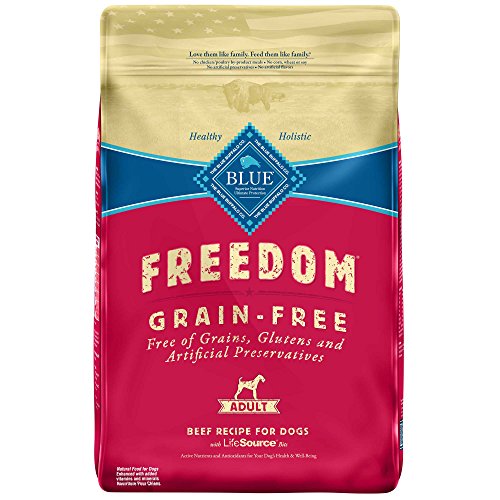 -. Binding : Misc. -. Brand : Blue Buffalo -. Feature : Delicious, protein-rich, Deboned Beef / None of the grains that contain glutens / NO chicken (or poultry) by-product meals / NO corn, wheat or soy / NO artificial colors, flavors or preservatives -. Label : Blue Buffalo -. Manufacturer : Blue Buffalo -. PackageQuantity : 1 -. ProductGroup : Pet Products -. ProductTypeName : PET_SUPPLIES -. Publisher : Blue Buffalo -. Studio : Blue Buffalo -. Title : Blue Buffalo Blue Freedom Grain-Free Adult Beef Recipe Dry Dog Food