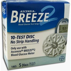 -. Feature : Ascensia Breeze 2 Blood Glucose Test Strips Only use with Ascensia Breeze 2 Blood Glucose Meter. / Sip-in Sampling - Automatic strip filling action. / 10 test disc, 5 Discs per box. / No Strip Handling.