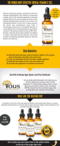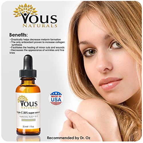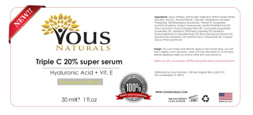 -. Binding : Misc. -. Brand : Vous Naturals -. EAN : 0705332342537 -. Feature : VOUS NATURALS Vitamin C Serum 20% is unique and the most stable and effective on the market today. Containing 3 separate forms of Vitamin C for the best and durable results! / PROUDLY made in U.S.A with the best and and highest quality ingredients. / WE CARE here at Vous Naturals and know that Vitamin C will react with plastic containers making the vitamin C less effective! VOUS NATURALS ALWAYS USES AMBER GLASS BOTTLES! Only way to ensure that your vitamin C will retain Full Potency / THIS new and technological formulation works fast! Formulated with Hyaluronic Acid to help hydrate and moisturize your skin, giving you YOUTHFUL, RADIANT LOOKING SKIN / WE GUARANTEE the purity and BEST RESULTS FOR YOUR FACE. Ingredients: Aqua (Water), Hamamelis Virginiana (Witch Hazel) Water, Ascorbic Acid (L), Alcohol Denat., Glycerin, Magnesium Ascorbyl Phosphate, Tetrahexyldecyl Ascorbate, Vitamin E: Tocopheryl Acetate (D-alpha), Sodium Hyaluronate, Vanilla Planifolia Fruit Oil, Citrus Aurantium Dulcis (Orange) Peel Oil*, Lavandula Angustifolia (Lavender) Oil, Jasminum Officinale (Jasmine) Oil, Santalum Austrocaledonicum (Sandalwood) Oil, Rosa Damascena Flower Oil, Glycine Soja (Soybean) Oil, Xanthan Gum, Polysorbate 20, Caprylyl Glycol, Phenoxyethanol -. Label : Vous Naturals -. Manufacturer : Vous Naturals -. MPN : 705332342537 -. NumberOfItems : 1 -. PackageQuantity : 1 -. PartNumber : 705332342537 -. ProductGroup : Beauty -. ProductTypeName : BEAUTY -. Publisher : Vous Naturals -. Studio : Vous Naturals -. Title : NEW Professional Vitamin C serum for your face! Potent Anti Aging Serum! One Single Bottle Has Three Forms of Vitamin C Serum 20 % + Hyaluronic Acid + Vitamin E. This Product Will Keep Your Skin Radiant & More Youthful Looking By Neutralizing Free Radicals! Vous Naturals, the Newest and Most Stable Form of Vitamin C 20% Available on the Market!! ★ Don't Waste Your Time! Use the Best One! ★ Total Satisfaction in 30 Days or 100% Money Back ★ -. UPC : 705332342537