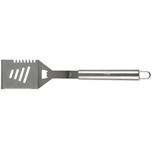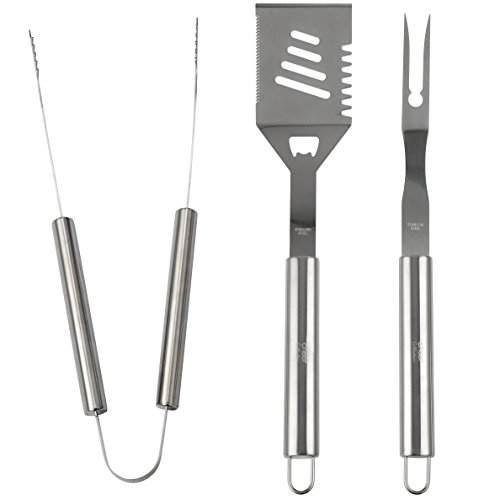 - ★ GRILLING ESSENSIALS SET: Includes multipurpose 4-in-1 slotted spatula turner with a sharp front, serrated side edge, meat tenderizer and built in bottle opener | heavy duty BBQ grilling tongs | barbecue meat fork with sharp tines for skewering. Extra-large hooks for hanging