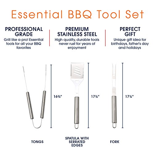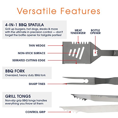 BBQ Utensil Set for Grilling | Professional Grade Stainless Steel 3 Piece Barbecue Grill Tools Set - Includes Essential bbq Accessories: 4-in-1 Spatula Turner, Tongs and Fork