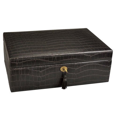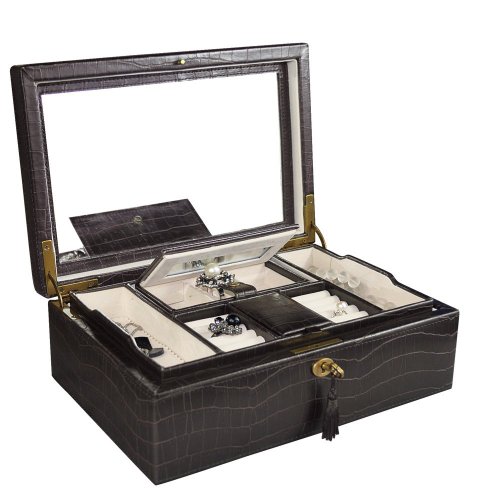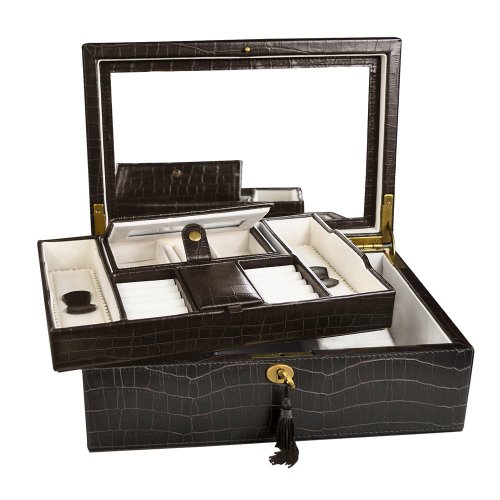 -. Binding : Home -. Brand : NILECORP -. Color : Espresso Brown -. EAN : 0885677023596 -. Feature : Finished in Crocodile Pattern Leatherette, interior lined with beige velvet. Made by durable synthetic leather. Lift out tray with traveling case (2 compartment center ring roll with mirror) / Bottom area showcases has 2 open sections and 3 watch holders. / Large mirror under the lid. / Safe lock with a key. / Measures 11"W x 7 1/2"D x 4"H when closed. Jewelry not included. -. Label : USA -. Manufacturer : USA -. Model : JB1493FBA -. MPN : JB3641 -. PackageQuantity : 1 -. PartNumber : JB3641 -. ProductGroup : Jewelry -. ProductTypeName : FINEOTHER -. Publisher : USA -. Size : 11"W x 7 1/2"D x 4"H -. Studio : USA -. Title : Ikee Design Espresso Brown Crocodile Pattern Luxury Jewelry Leatherette Case -. UPC : 853509005584