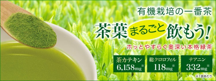 国産有機栽培の一番摘み茶葉100%! 茶葉の栄養がまるごと摂れる粉末緑茶 日本人にとってお茶を飲む習慣は欠かせないもの。古くから美容、健康食材として用いられている緑茶には、カテキンをはじめ、多彩な栄養が豊富に含まれています。 『DHC茶葉まるごとカテキン粉末緑茶』は100%鹿児島県産有機栽培茶葉を、まるごと使用した粉末緑茶。バリアや流れ、スタイルにもアプローチする[茶カテキン]を、1袋あたり6,158mg含有しています。 収穫したお茶の葉をまるごと粉砕してできる粉末緑茶。お湯に溶かして茶葉そのものを飲むことで、水やお湯に溶けにくい食物繊維やビタミン類、クロロフィルなど、茶葉にふくまれるさまざまな美容・健康成分を、残さず効率的に摂ることができます。茶葉をまるごと食べるため、安心・安全な国産の有機栽培茶葉を使用しました。 おいしさにもこだわり、一番摘みの茶葉のみを使用。お湯を注ぐとふわりと新鮮な香りが広がり、まろやかで奥深く、ほろ苦い味わいをお楽しみいただけます。 健康値が気になる方、きれいを保ちたい方におすすめの、簡単・手軽にできる健康習慣です。 . <有機JAS認定>オーガニック茶 農林水産省の登録認定機関より、茶畑から仕上げ加工・包装まで認定を受けたお茶です。3年以上の間、有機JAS規格で認められていない農薬や化学合成肥料を使用していない茶畑で育まれました。 製法にこだわり粉末化! 茶葉の栄養まるごと 緑茶は茶葉にお湯を注いで入れた場合、カテキンやビタミンCなどの水溶性成分しかお湯に溶け出ず、食物繊維やビタミン類、クロロフィルなど約70%もの有効成分は茶殻に残ってしまいます。 しかし、茶葉の栄養をそのままに粉末化した『DHC茶葉まるごとカテキン粉末緑茶』であれば、栄養を100%摂ることができます。 さらに、熱の発生を抑えるこだわりの製法で粉末化することで、熱による栄養の変化や酸化、風味・色調の劣化を最小限に抑えています。 . お召し上がり方 湯のみ茶碗にティースプーン約1/2杯(約0.5g)を入れてお湯約100mlを注ぎ、溶け残りがないようによくかき混ぜてお召し上がりください。 【アイスで飲む場合】 少量のお湯を注ぎ、溶け残りがないようによくかき混ぜます。その後、水を注ぎ、氷を入れてください。濃い目につくると、いっそうおいしくお召し上がりいただけます。 ●濃さはお好みで調節してください。 ●湯のみ茶碗の底に沈んだお茶にも栄養成分が含まれておりますので、よくかき混ぜて最後までお召し上がりください。 ●料理やお菓子づくりにもお使いいただけます。 . ※直射日光、高温多湿な場所をさけて保存してください。また移り香にご注意ください。 ※お湯でのやけどには充分注意してください。 ※吸湿しやすいので、開封後はできるだけ空気をぬいてしっかり開封口を閉め、なるべく早くご使用ください。また、作り置きはせず、早めにお召し上がりください。 ※お身体に異常を感じた場合は、飲用を中止してください。 ※本品は農産物を使用しているため、色調や味・風味等に差が生じる場合がありますが、品質に問題はありません。 ※茶葉の中に白い粉が混ざる場合がありますが、茎の繊維質ですので品質に問題はありません。 ※本品には品質保持のため、脱酸素剤が入っています。誤って召し上がらないようご注意ください。 ■ 成分・原材料 【名称】有機粉末緑茶 【原材料名】有機緑茶(鹿児島県産) 【内容量】40g 【栄養成分(1袋40gあたり)】熱量111kcal、たんぱく質9.6g、脂質2.3g、炭水化物18.3g(糖質7.7g、食物繊維10.6g)、食塩相当量0.006g カルシウム104mg、鉄6.5mg、ビタミンA640μg、ビタミンC198mg、ビタミンE11.1mg 茶カテキン6158mg、総クロロフィル118mg、テアニン332mg、カフェイン0.88g 販売者 株式会社ディ-エイチシー 製造所 丸山製茶株式会社 広告文責 株式会社若杉エンタープライズ 0120-961-866 |