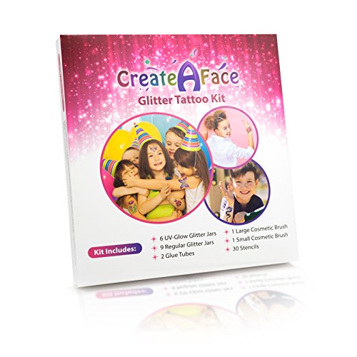 Create A Face Glitter Tattoo Kit - 15 Hypoallergenic Powder For Temporary Tattoos, 32 Cool Stencils, 2 Glue Applicator & 2 Cosmetic Brushes for Kids, Girls and...