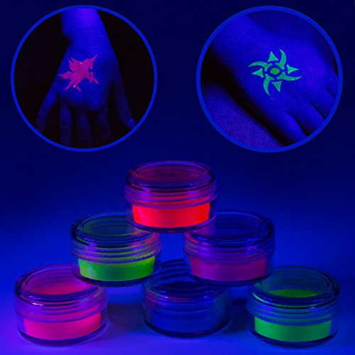 - SIMPLY THE MOST COMPLETE GLITTER TATTOO SET ON THE MARKET (Includes 6 UV Reactive Colors). - This set has everything you need to instantly create body art, leave a great impression and have lots of fun: 15 super-sized (10ml) glitter pots, including 2X cosmetic brush & 2X special formula glue applicators.