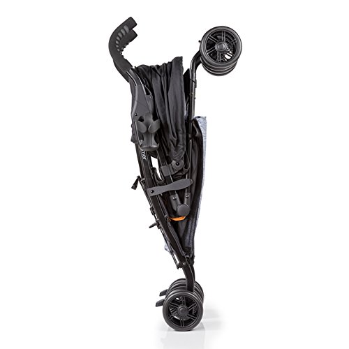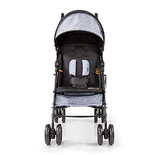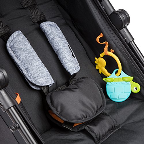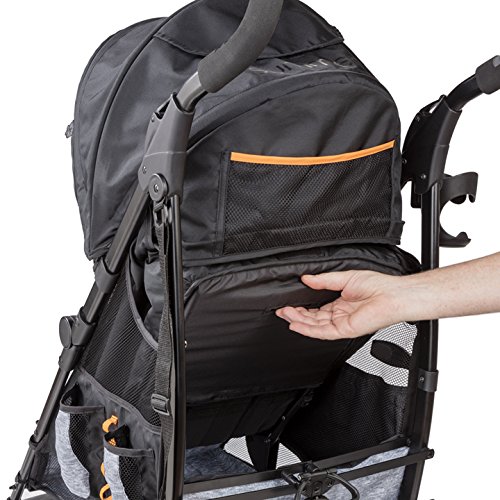 1 hand recline, padded 5-point safety harness with easy pop buckle, and large canopy with pop out visor and peek-a-boo window