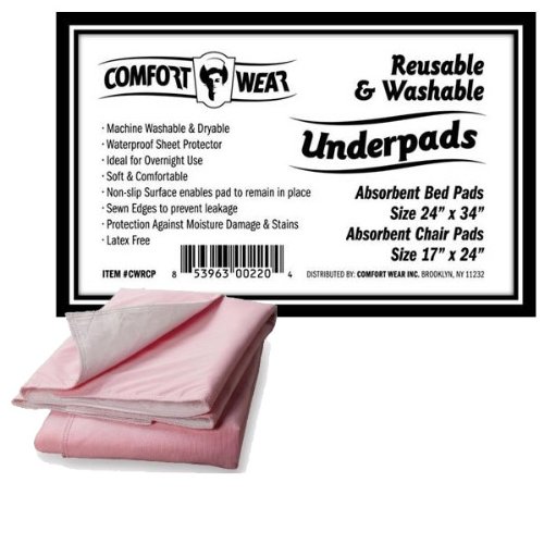 Studio : MaxiAids Publisher : MaxiAids Binding : Health and Beauty Product Description Rest comfortably and confidently at night, or when relaxing in your favorite chair! Reusable and Washable Underpads provide reliable, absorbent incontinence protection for beds and bedding, chairs or other surfaces in your home. FEATURES SPECIFICATIONS: - Machine washable and dryable - Waterproof sheet protector - Ideal for overnight use - Soft and comfortable - Non-slip surface enables pad to remain in place - Sewn edges prevent leakage - Provides protection against moisture damage and stains - Latex-Free Combo Pack includes: - Three 17" x 24" pads (Great size for chairs) - Three 24" x 36" pads (Great size for beds) 0