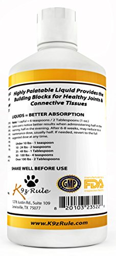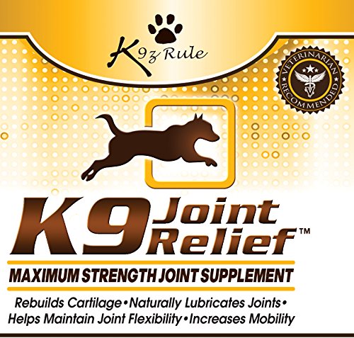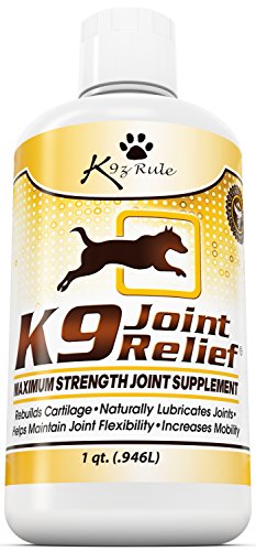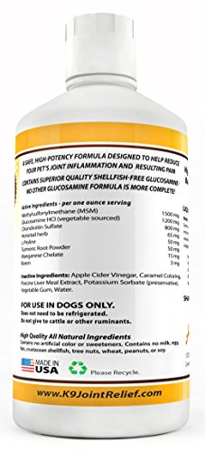 Help Your Dog Stay Free from Joint Pain - GUARANTEED! Listen, if you're anything like my wife and I, your dog is a member of your family. They're more than just a pet. You care about them like you do any other member of your family. So the last thing you want to see is your dog in pain. But, just like us, as they age their joints begin to deteriorate. And of course this deterioration can cause excruciating pain and can even be disabling. That's Where K-9 Joint Relief Comes In - K-9 Joint Relief is a Veterinarian Recommended, superior quality, all natural hip and joint supplement, specially formulated for dogs. It's manufactured in the U.S. in a state-of-the-art FDA approved facility under strict quality assurance guidelines. We use a highly palatable liquid formula because liquid supplements have been shown to have a higher absorption rate than pills or capsules. It's also simple to use: just pour it over wet or dry dog food or mix it in their drinking water. K-9 Joint Relief reduces your pet's joint inflammation and associated pain, improves flexibility and mobility and reduces stiffness, rebuilds and repairs damaged cartilage, helps maintain normal joint structure and function in healthy dogs, and promotes the production of synovial fluid which lubricates and cushions the joints. Works Great For All Dogs, Young and Old - Our unique formula contains Glucosamine, Chondroitin, and MSM plus a synergistic blend of Horsetail herb, Proline, Boron, Grape Seed Extract, and Manganese. You won't find a more complete formula anywhere. Helps Homeless Dogs Too - We donate 5% of the proceeds from each sale to organizations that rescue and care for homeless dogs. 1 Year Money Back Guarantee - We stand behind our products. If you're unhappy with our product for any reason just return the bottle and we'll give you a full refund (one per customer). So, If You'd Like Your Dog To Live a Long Happy Healthy Life Free From Joint Pain, Order a Bottle of K-9 Joint Relief Today.Feature