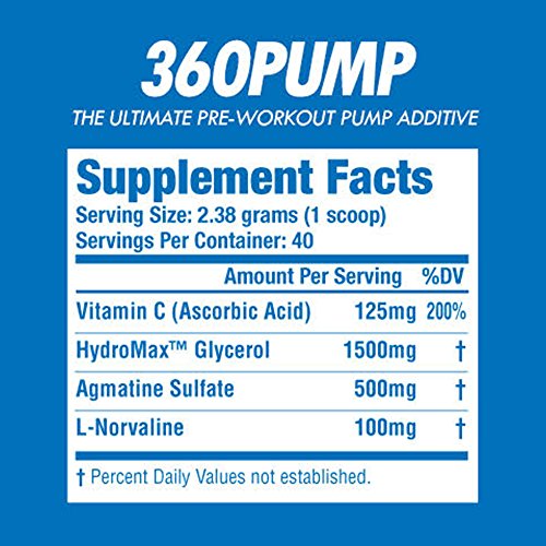 -. Feature : PRE-WORKOUT PUMP ENHANCER - One scoop added to your pre workout formula before training results in better strength and endurance, and improved pumps during even the most intense workouts. / SPECIALLY FORMULATED - Contains HydroMax Glycerol, Agmatine Sulfate and L-Norvaline, designed to boost Nitric Oxide production, increase vasodilatation, and promote hyperhydration. Helps increase stamina during intensive training and promotes muscle cell hydration. Achieve record-breaking pumps without stimulants. / PROMOTES BETTER VASCULARITY & HYDRATION - Improves blood flow and provides hydration support during resistance training. Helps with resilience and efficiency, giving you the performance boost you've been looking for. You can't beat this combo. / 360PUMP is manufactured in a GMP-Certified facility, which means that guidelines are followed to provide a system of processes, procedures, and documentation that assure 360PUMP has the identity, strength, composition, quality and purity that appears on its label.