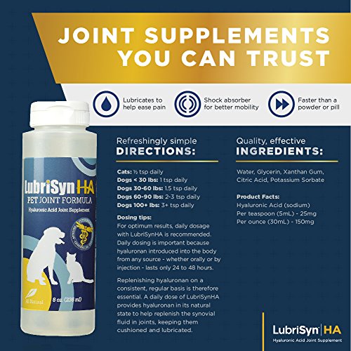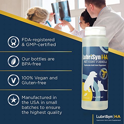 MAINTAIN HEALTHY JOINTS FOR AN ACTIVE LIFESTYLE - Promote flexible, lubricated joints so your pet can maintain his competitive edge in obedience, agility and performance - or stay active in his senior years. Giving a daily source of hyaluronan from hyaluronic acid is a great alternative to stressful injections or messy powders. The hyaluronan in LubriSynHA naturally protects the integrity of your pet's synovial fluid, promoting healthy joints and connective tissue for years to come!
