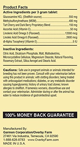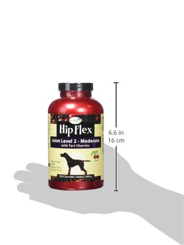 Overby Farm Hip Flex Joint Level 2 Moderate Care with Tart Cherries Formulated to Promote Joint Health and Agility in Active and Aging Canines, Including Large Breeds and Overweight Dogs. Helps Alleviate Aches and Discomfort Associated with Daily Exercise. Tart Cherry Concentrate is a Natural Antioxidant and Helps to Avoid Discomfort by Supporting the Body's Normal Inflammatory Response. Helps Support the Structural Integrity of Joints and Connective Tissues. Chewable, Tasty Tablets, 120ct for Dogs. Recommended to Double the Suggested Daily Amount for the First 3 Weeks. Active Ingredients per 3 Gram Tablet: Glucosamine, Methylsulfonylmethane (MSM), Tart Cherry and Dark Berry Proprietary Blend, Ascorbic Acid (Vitamin C), Linolenic Acid Omega 3, Linolenic Acid Omega 6 and di-Alpha Tocopheryl (Vitamin E). All Overby Farm Products are Veterinarian Formulated and Manufactured in the USA in an FDA Audited, cGMP Compliant Facility with a 100% Satisfaction Guarantee.Feature