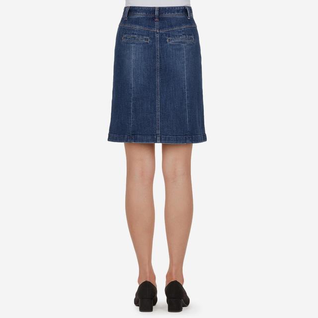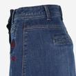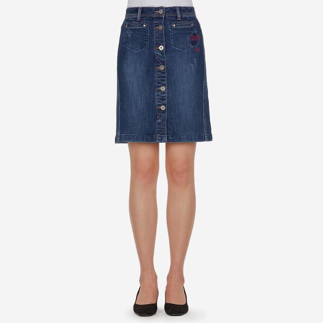 레드 컬러감의 자수 로고로 포인트를 주었으며 중앙 단추 장식으로 다양한 스타일로 연출이 가능한 데님 스커트입니다.