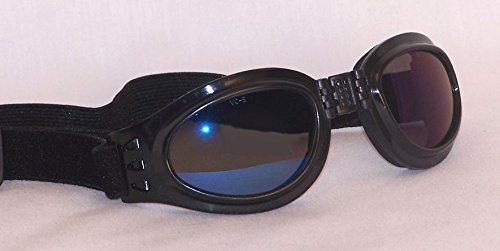 -. Feature : ANSI Z87 Safety Goggles with blue mirror lenses with padded eye cups / Shatter resistant, polycarbonate lenses that shield 99.9% of UVA and UVB light. / Hinged nose bridge makes goggles foldable. / Black frame and adjustable black elastic strap. / Sporty and stylish.