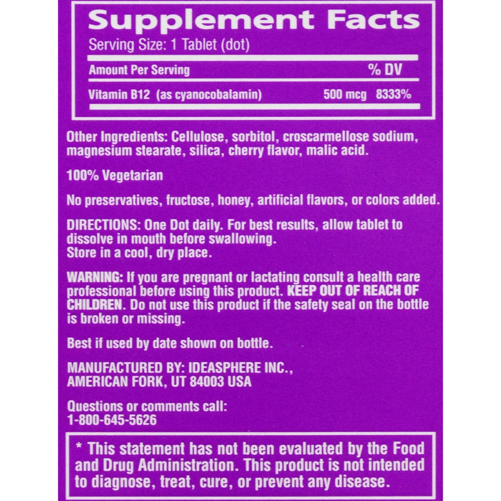 Vitamin B-12 (cyanocobalamin), a member of the B-complex family, helps maintain healthy nerve cells and red blood cells, is needed to make DNA and plays an important role in natural energy production. Twinlab B-12 Dots are specially formulated microtablets that dissolve quickly in the mouth before swallowing. Each delicious natural cherry-flavored dot provides 500 mcg of vitamin B-12. Disclaimer These statements have not been evaluated by the FDA. These products are not intended to diagnose, treat, cure, or prevent any disease.Ingredients : B-12 Dots are specially formulated, tiny, micro-sublingual Vitamin B-12 tablets. Size : 250 DOT Pack of : 1 Product Selling Unit : each |