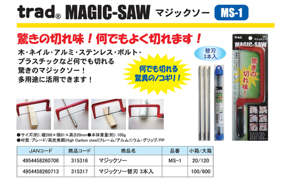 【商品名】 (業務用3個セット) TRAD マジックソー(ノコギリ/大工道具) 縦268mm×横81mm×高さ20mm MS-1 〔DIY用品 工作 趣味 日曜大工〕 【ジャンル・特徴】 驚きの切れ味!木・ネイル・ステンレス・ボルト等何でも切れる鋸 ■サイズ・色違い・関連商品■マジックソー 3個セット[当ページ]■マジックソー 9個セット■マジックソー替刃 15個セット ■商品内容 【ご注意事項】・この商品は下記内容×3セットでお届けします。木・ネイル・アルミ・ステンレス・ボルト・プラスチックなど何でも切れます。多用途に活用できます。■商品スペック●サイズ(約):縦268x横81x高さ20mm ●本体重量(約):105g ●材質:ブレード/高炭素鋼(High Carbon Steel) フレーム/アルミニウム/ グリップ/PP■送料・配送についての注意事項●本商品の出荷目安は【1 - 7営業日 ※土日・祝除く】となります。●お取り寄せ商品のため、稀にご注文入れ違い等により欠品・遅延となる場合がございます。●本商品は同梱区分【TS1】です。同梱区分が【TS1】と記載されていない他商品と