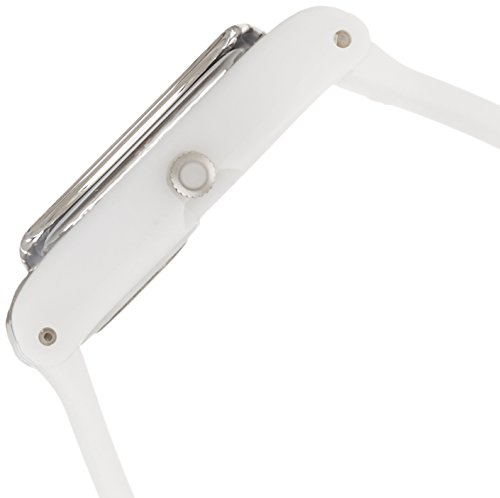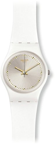 White plastic case with a white silicon strap. Fixed white plastic bezel. Sun- brushed silver dial with gold-tone hands and dot hour markers. Minute markers around the outer rim. Dial Type: Analog. Luminescent hands. Quartz movement. Plexiglass crystal. Pull / push crown. Solid case back. Case diameter: 25 mm. Case thickness: 7 mm. Round case shape. Band width: 12 mm. Band length: 6 inches. Tang clasp. Water resistant at 30 meters / 100 feet. Functions: hour, minute, second. Casual watch style. Swatch White Mouse Sun- Brushed Silver Dial Ladies Watch LW148.Feature