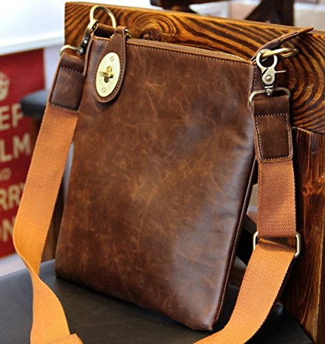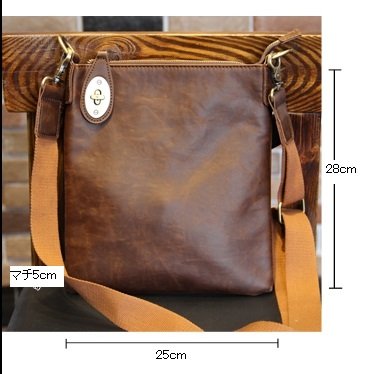 -. Feature : サイズは 25 x 28 x 5 cm ジャストサイズのメッセンジャーバッグです。 / 内部のポケットは3つ、お財布、スマートフォン、ipad mini等が入ります。 / 雨をはじき、キズにも強いレザー製です。 / ファスナー部分は簡単に開かないようにロック付 / カラーはブラウンのレザーなのでとても落ち着いた感じの印象です。