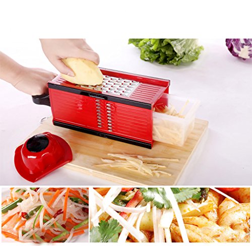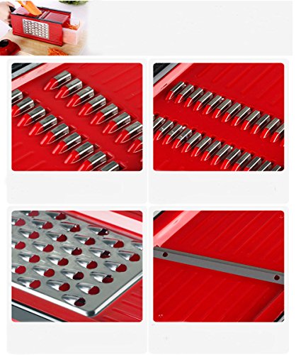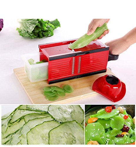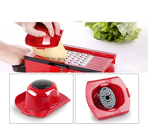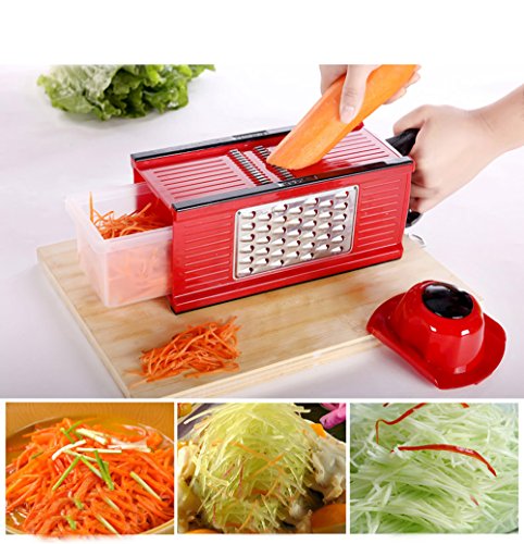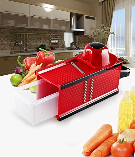 SUMCOO Mandoline Slicer With 4 Blades - Fruit and Cheese Cutter, Carrot Grater, Onion Chopper, Julienne Peeler - Vegetable Slicer with Food Safety Holder and Container(Red)