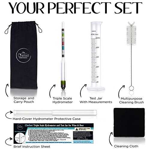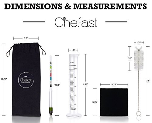 Chefast Hydrometer and Test Jar for Wine, Beer, Mead and Kombucha - Combo Set of Triple-Scale Hydrometer, 250ml Plastic Cylinder, Cleaning Brush, Cloth and Storage Bag - ABV, Brix and Gravity Test Kit