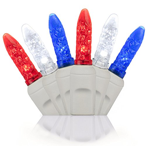 Holiday Lighting Outlet M5 / M6 70-Count LED Patriotic Red, Cool White, Blue Indoor/Outdoor Mini Ice Light String For 4th of July, Event, Party, Decor, Tree, and Lawn Lighting, White Cord, UL Listed.